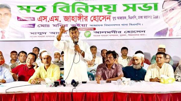 ঢাকা মহানগর উত্তর বিএনপি যুগ্ন আহবায়ক এস এম জাহাঙ্গীর হোসেন বলেছেন বিএনপির কেউ যদি অপকর্মে জড়িত থাকে, তিনি দলের যেকোনো পর্যায়ের হোন না কেন—প্রথমে দলীয়ভাবে সিদ্ধান্ত নেওয়া হবে। এরপরও যদি সমাজের কেউ তার বিরুদ্ধে মামলা করতে না চান, তবে আমি নিজেই বাদী হয়ে তার বিরুদ্ধে মামলা করব। সোমবার রাতে সন্ধ্যায় ঢাকা মহানগর উত্তর বিমানবন্দর থানা বিএনপি এবং দক্ষিণখান থানা বিএনপির আয়োজনে গাওইর কাজী বাড়ি এলাকায় সাধারণ জনগণের সঙ্গে অনুষ্ঠিত এক মতবিনিময় সভায় প্রধান অতিথির বক্তব্যে বিএনপি নেতা এসএম জাহাঙ্গীর হোসেন এ কথা বলেন। বিমানবন্দর থানা বিএনপির আহবায়ক মনির ভূঁইয়ার সভাপতিত্বে সভায় এলাকার গণ্যমান্য ব্যক্তি, রাজনৈতিক নেতা এবং সাধারণ মানুষ স্বতঃস্ফূর্তভাবে অংশ নেন। তারা জনদুর্ভোগ ও উন্নয়ন ঘাটতির নানা চিত্র তুলে ধরেন। জনগণের প্রশ্নের জবাবে এসএম জাহাঙ্গীর হোসেন বলেন, বিএনপি রাষ্ট্র মেরামতের জন্য ৩১ দফা কর্মসূচি দিয়েছে। সেই কর্মসূচি ঘরে ঘরে পৌঁছে দেওয়ার জন্য আমরা কাজ করছি। দীর্ঘ ১৭ বছর ফ্যাসিবাদী আওয়ামী লীগ সরকার জনগণের উপর জুলুম-নির্যাতন ও চাঁদাবাজি চালাচ্ছে, সমাজকে একটি অব্যবস্থাপনায় পরিচালনা করছে। এর থেকে পরিত্রাণের জন্যই আজকে সাধারণ মানুষকে সঙ্গে নিয়ে মতবিনিময় করেছি। তিনি আরও বলেন, বিএনপি গণমানুষের দল—মানুষের পরামর্শ নিয়েই আমরা পথ চলবো। বিএনপির ভারপ্রাপ্ত চেয়ারম্যান তারেক রহমান একটি মানবিক রাষ্ট্র গঠন করতে চান। তিনি মানবিক রাষ্ট্র গঠনের জন্য যে কর্মসূচিগুলো দিয়েছেন, আমরা সেগুলো জনগণকে সঙ্গে নিয়েই পালন করে যাচ্ছি, যাতে প্রতিটি সিদ্ধান্তে মানুষের পরামর্শ সম্পৃক্ত থাকে।এসএম জাহাঙ্গীর হোসেন আরও বলেন,আপনারা যদি বেগম খালেদা জিয়ার সঙ্গে থাকেন, তারেক রহমানের সঙ্গে থাকেন, তাহলে এমন কোনো শক্তি নেই যে বিএনপিকে পরাজিত করতে পারবে। অতীতে যতবার সুষ্ঠু নির্বাচন হয়েছে, ততবারই বিএনপি জয়লাভ করেছে কারণ আপনারা বিএনপির পাশে ছিলেন। বিএনপি গণমানুষের দল। যদি তারেক রহমান বাংলাদেশের প্রধানমন্ত্রী হন, তাহলে দেশের উন্নয়ন হবে জনগণের চাহিদা অনুযায়ী। অতীতে বিএনপি উন্নয়ন করেছে, ভবিষ্যতেও সেভাবেই উন্নয়ন করবে।