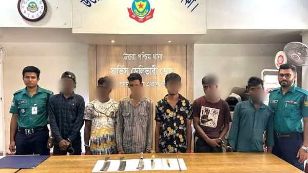 মোঃ মুজাহিদুল ইসলামঃ রাজধানীর উত্তরা এলাকায় ডাকাতির প্রস্তুতিকালে দেশীয় অস্ত্রসহ ডাকাত দলের ৬ সক্রিয় সদস্যকে গ্রেফতার করেছে ডিএমপির উত্তরা পশ্চিম থানা পুলিশ। গ্রেফতারকৃতরা হলো- ১। রাসেল মিয়া (২২) ২।